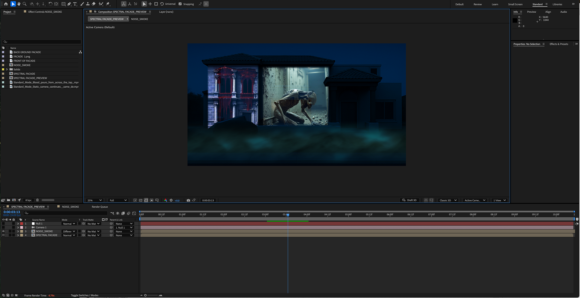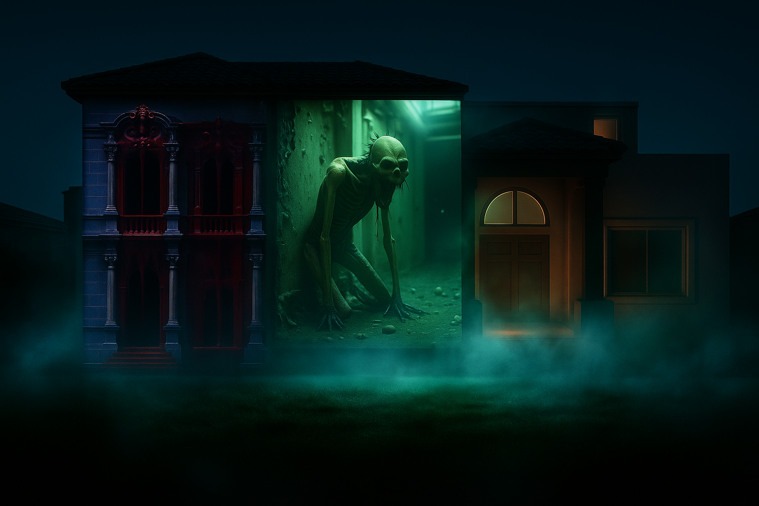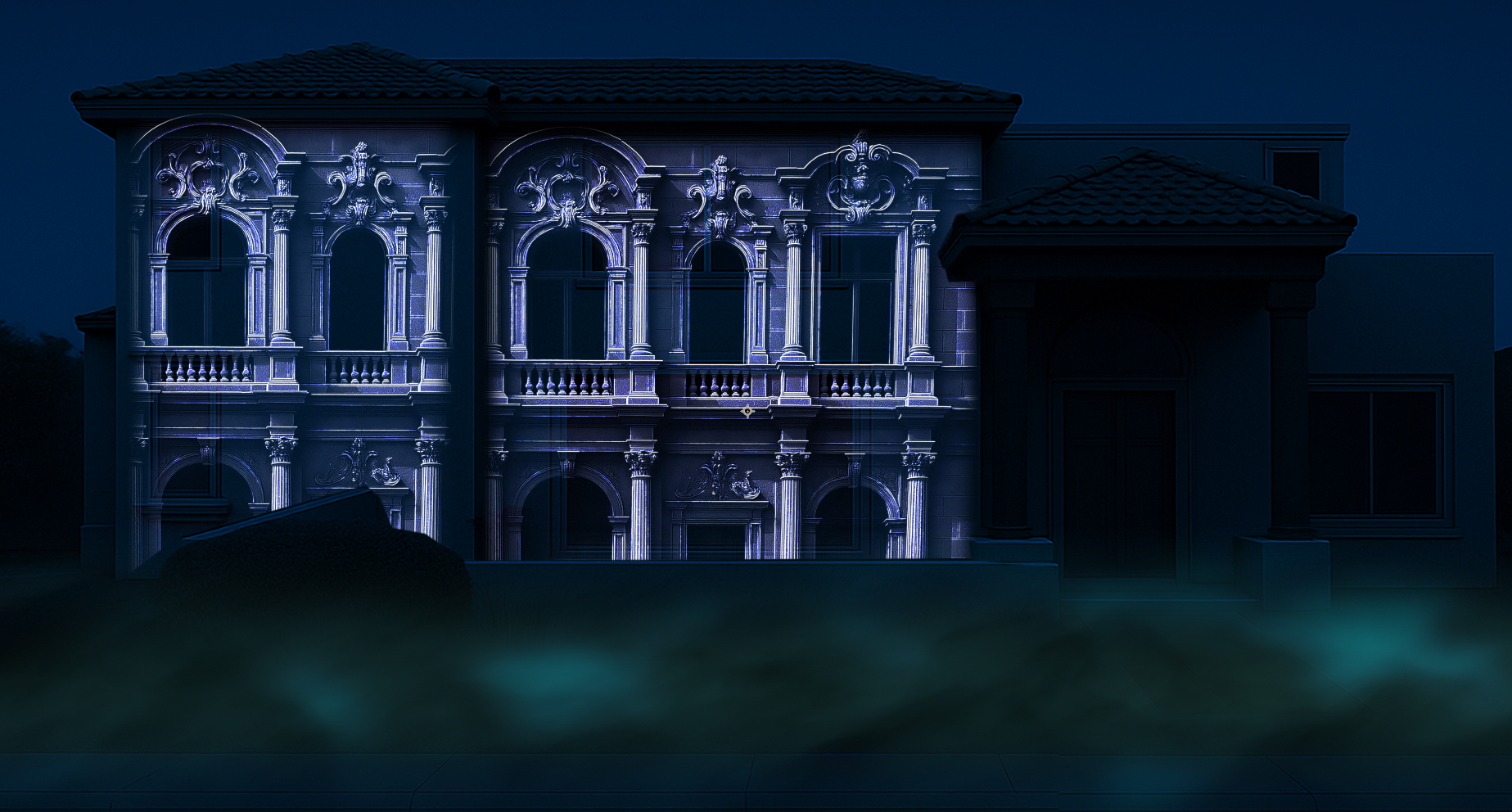 A decaying mansion becomes a haunted stage in this immersive projection piece. Spectral Facade merges AI-generated horror imagery with atmospheric storytelling, transforming classical architecture into a living canvas for dread. The result: a theatrical installation that blurs the line between the digital and the supernatural.