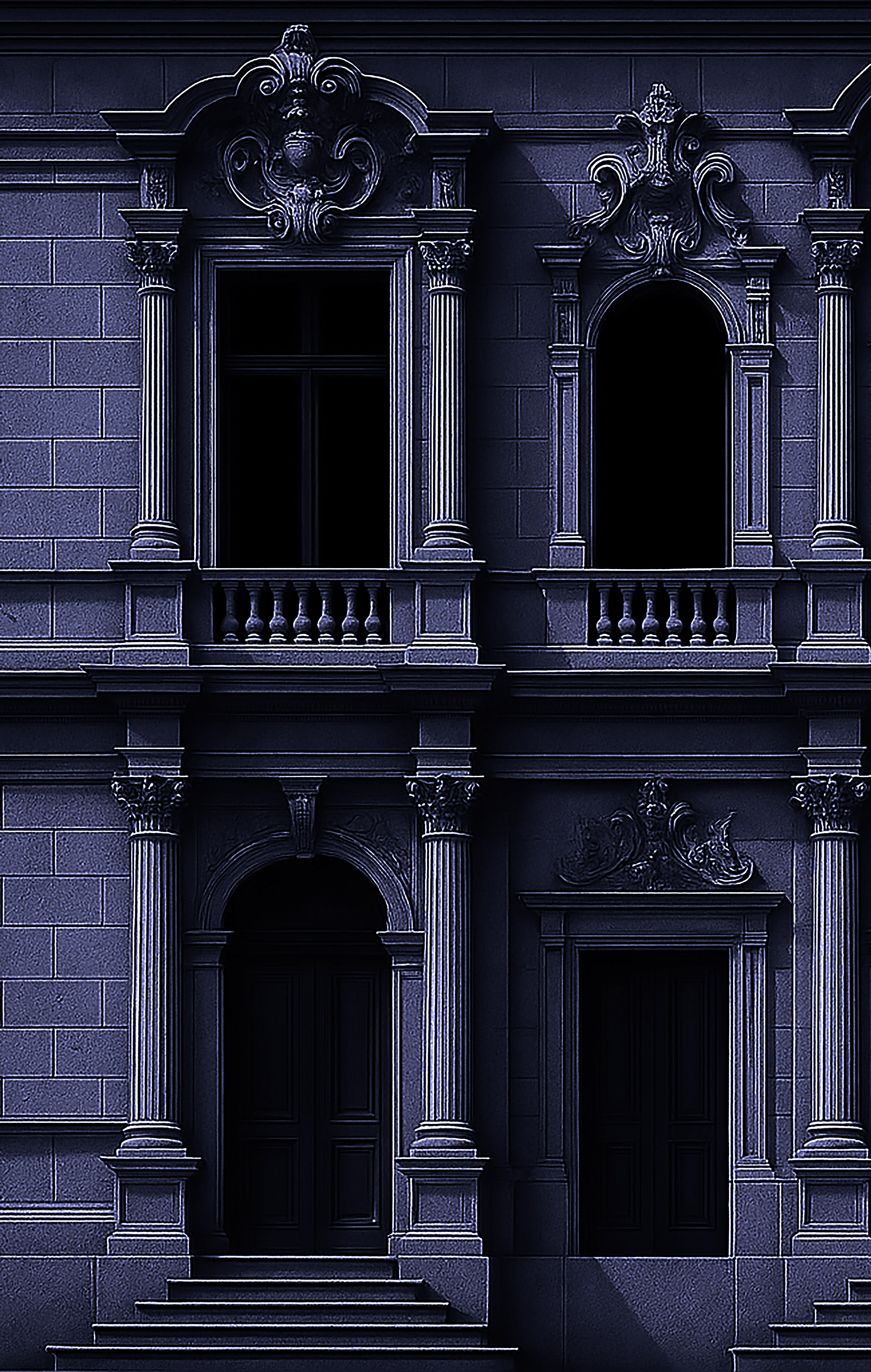 Description: A symmetrical Rococo-style house façade rendered in moody midnight tones. Its windows are dark voids, and the stone detailing casts eerie shadows under a cold sky.