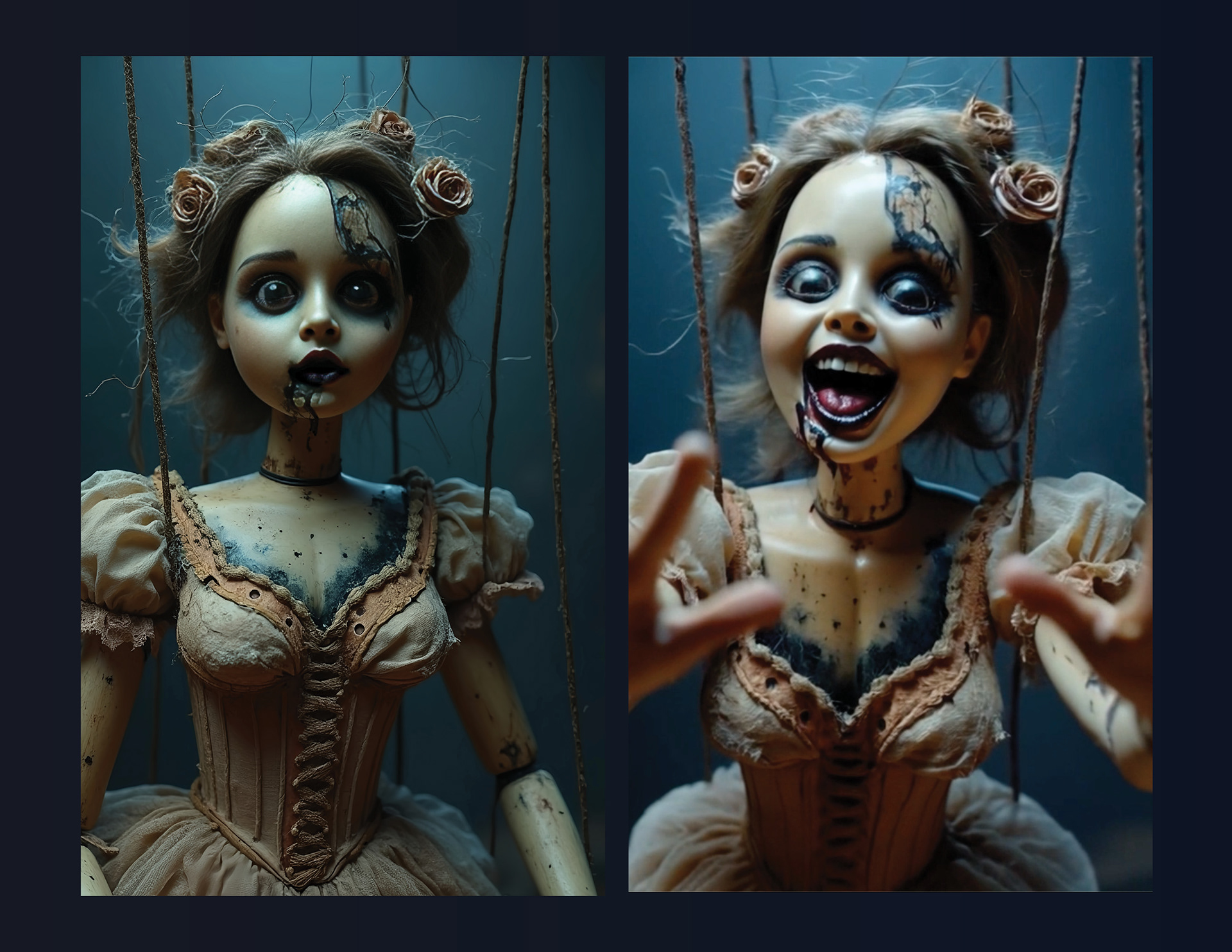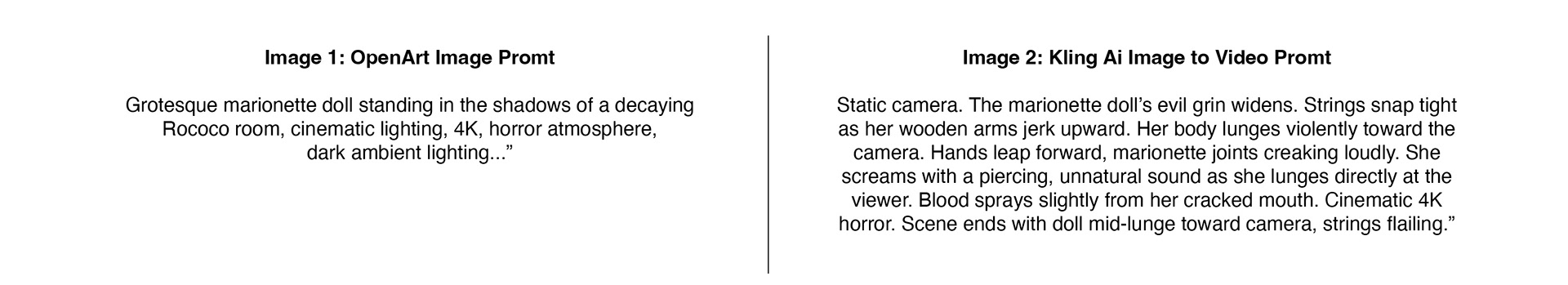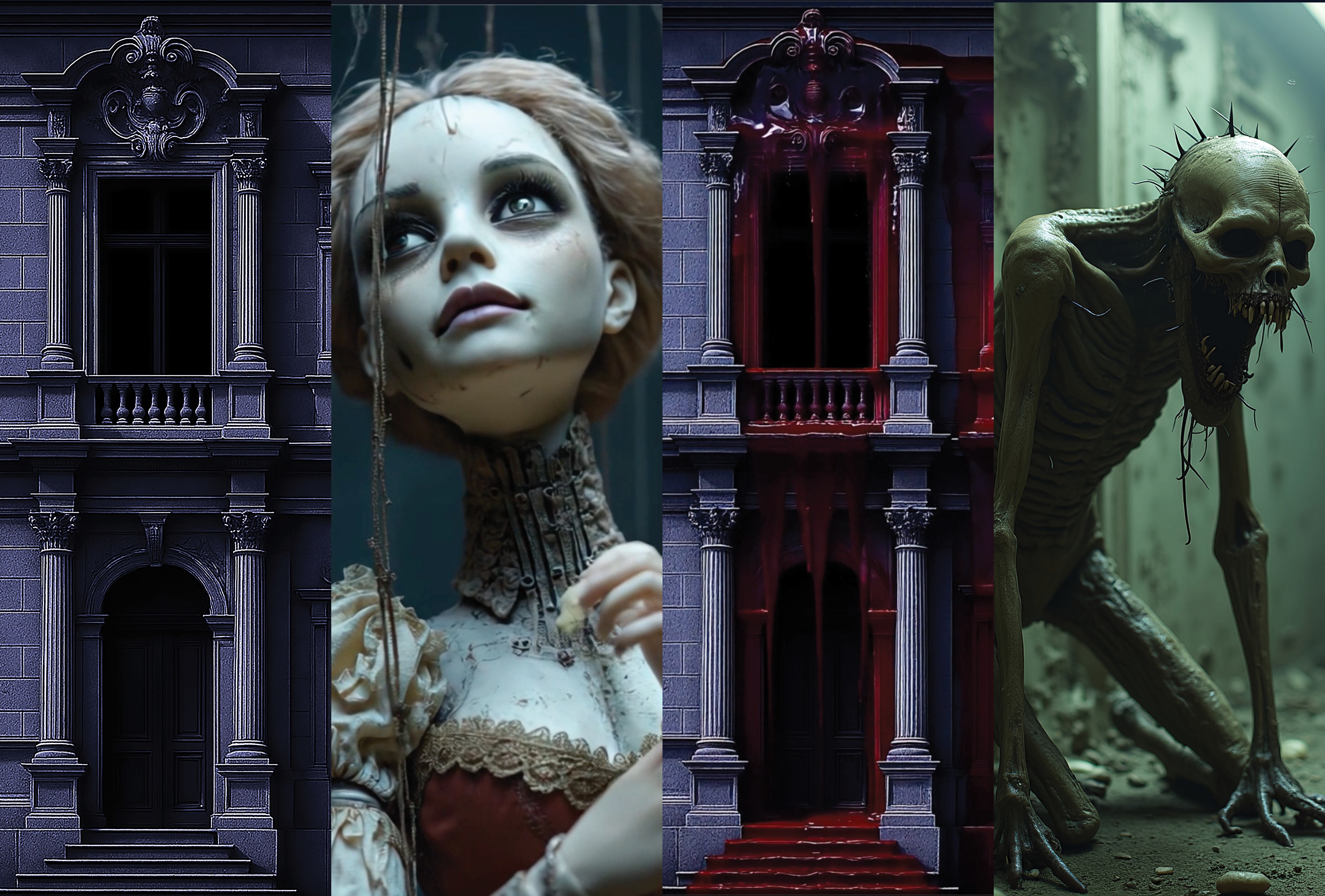 Imagery was generated using Kling AI and OpenArt. Each scene began with architectural base renders, layered with character prompts like “porcelain doll in decayed