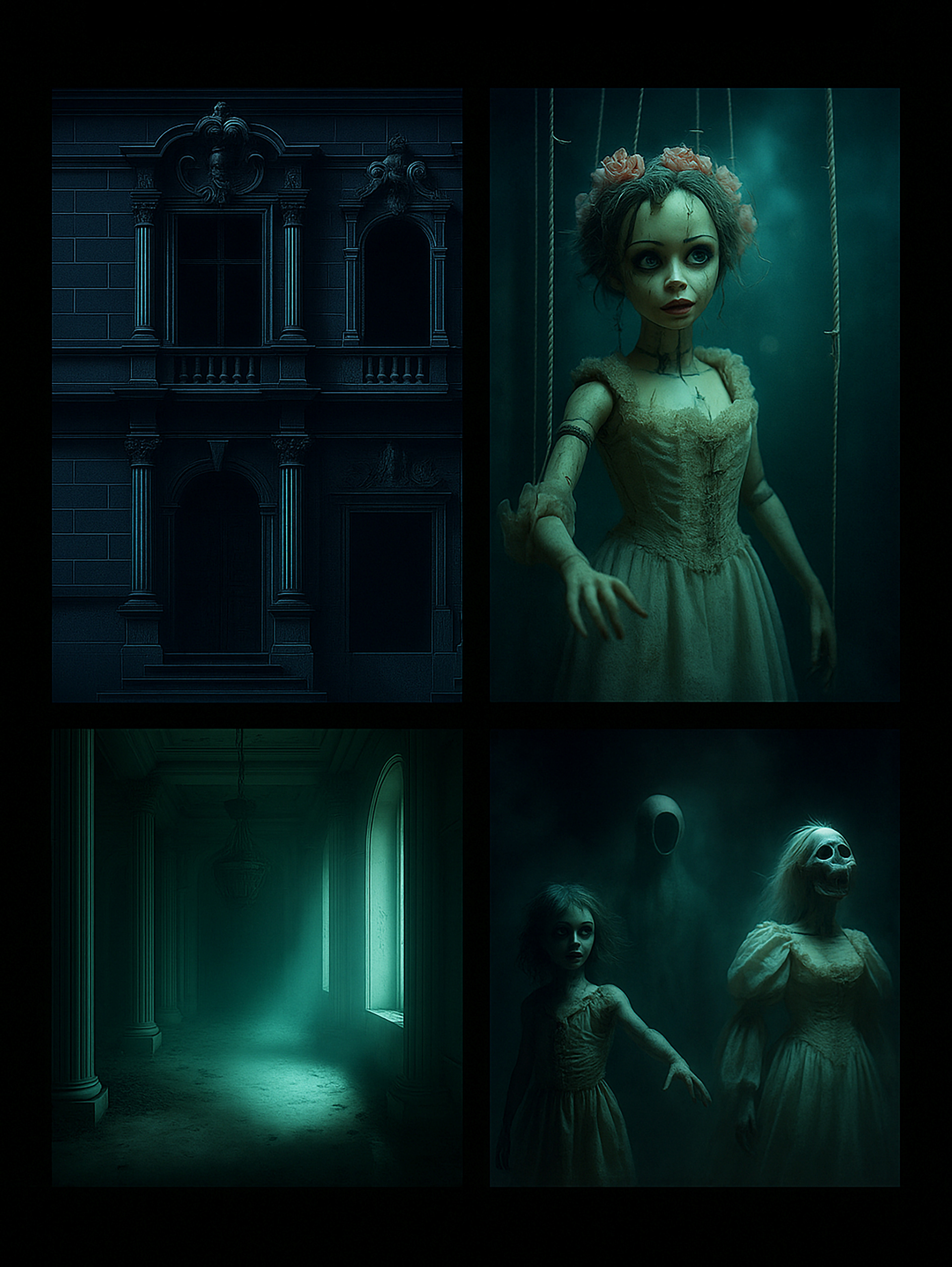 The aesthetic blends gothic decay, Rococo ornamentation, and puppet horror. Key motifs include marionette dolls, skeletal figures in period dress, crumbling interiors, and corrupted architecture. Lighting remains dramatic, with moonlit contrast, flickering blood-mist overlays, and ambient shadows. Colors stay desaturated with violent bursts of red.