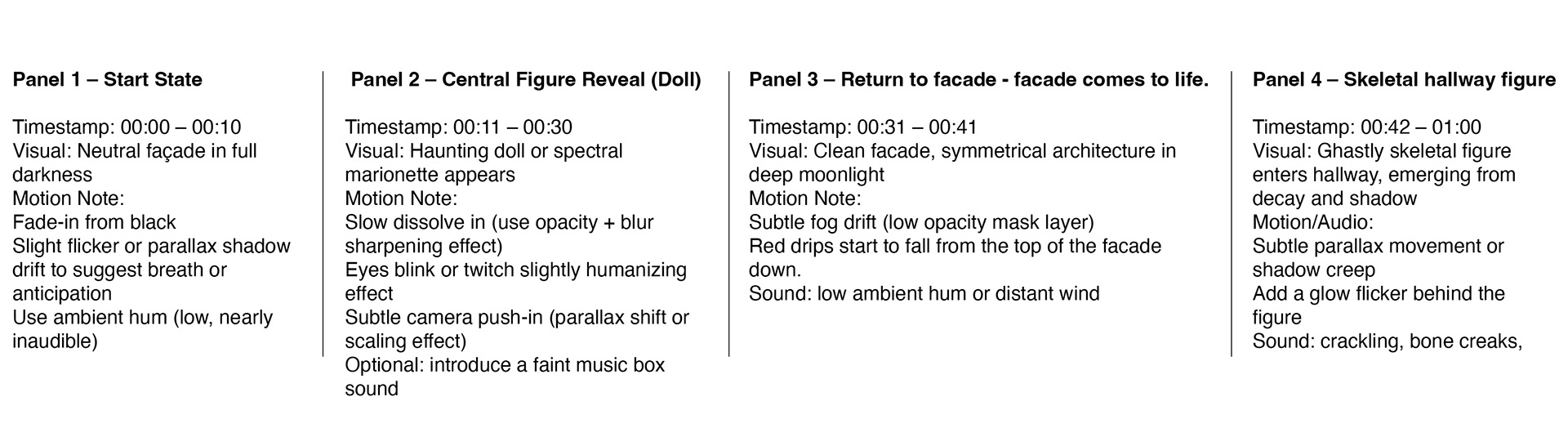 This short projection follows a cinematic arc across the house: from silence to spectral collapse. Each beat, red seepage, skeletal forms, blinking dolls, is timed for tension.