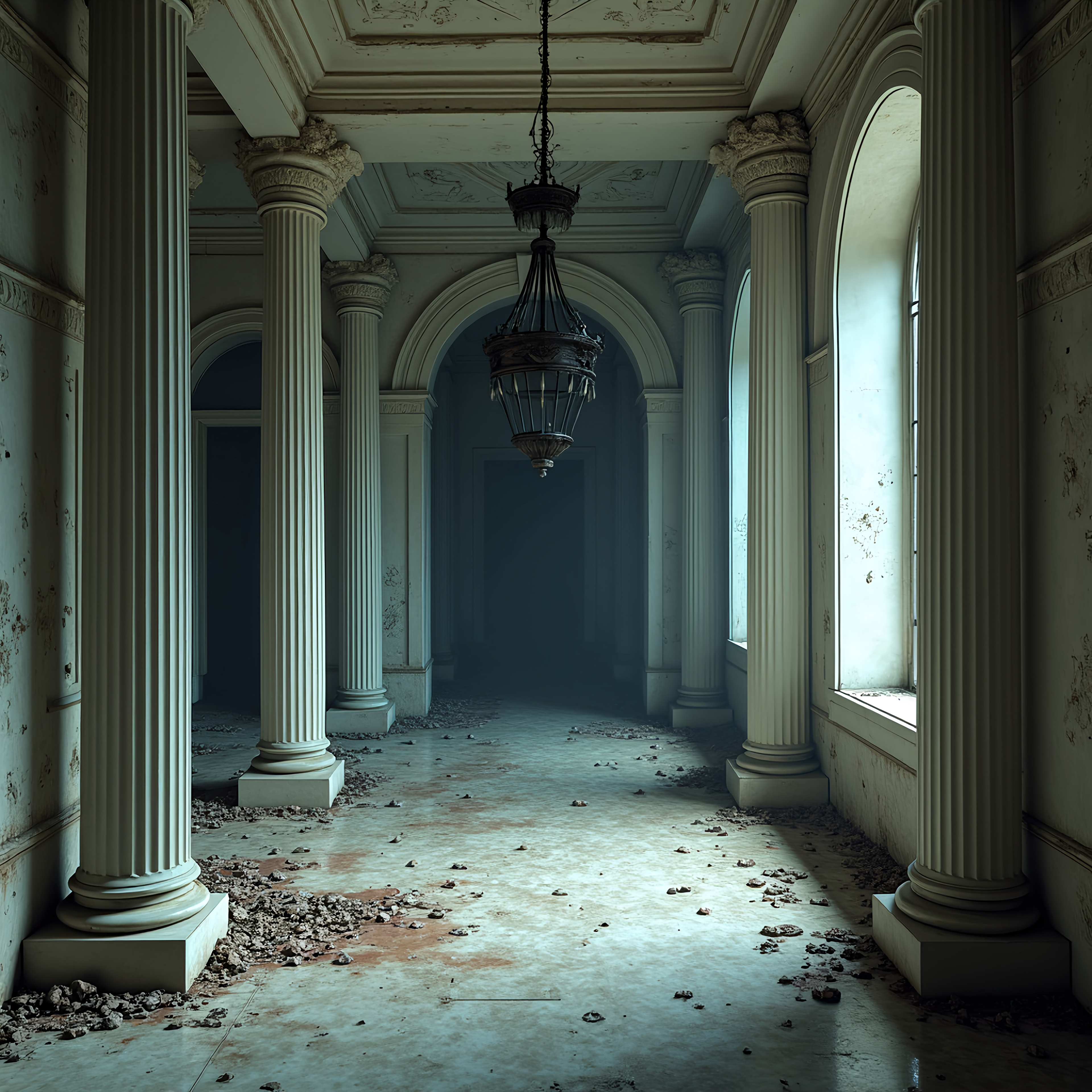 Description: A light-starved marble corridor lined with ornate columns and a rusted chandelier. Crumbling plaster and dirt-strewn floors suggest years of abandonment.
