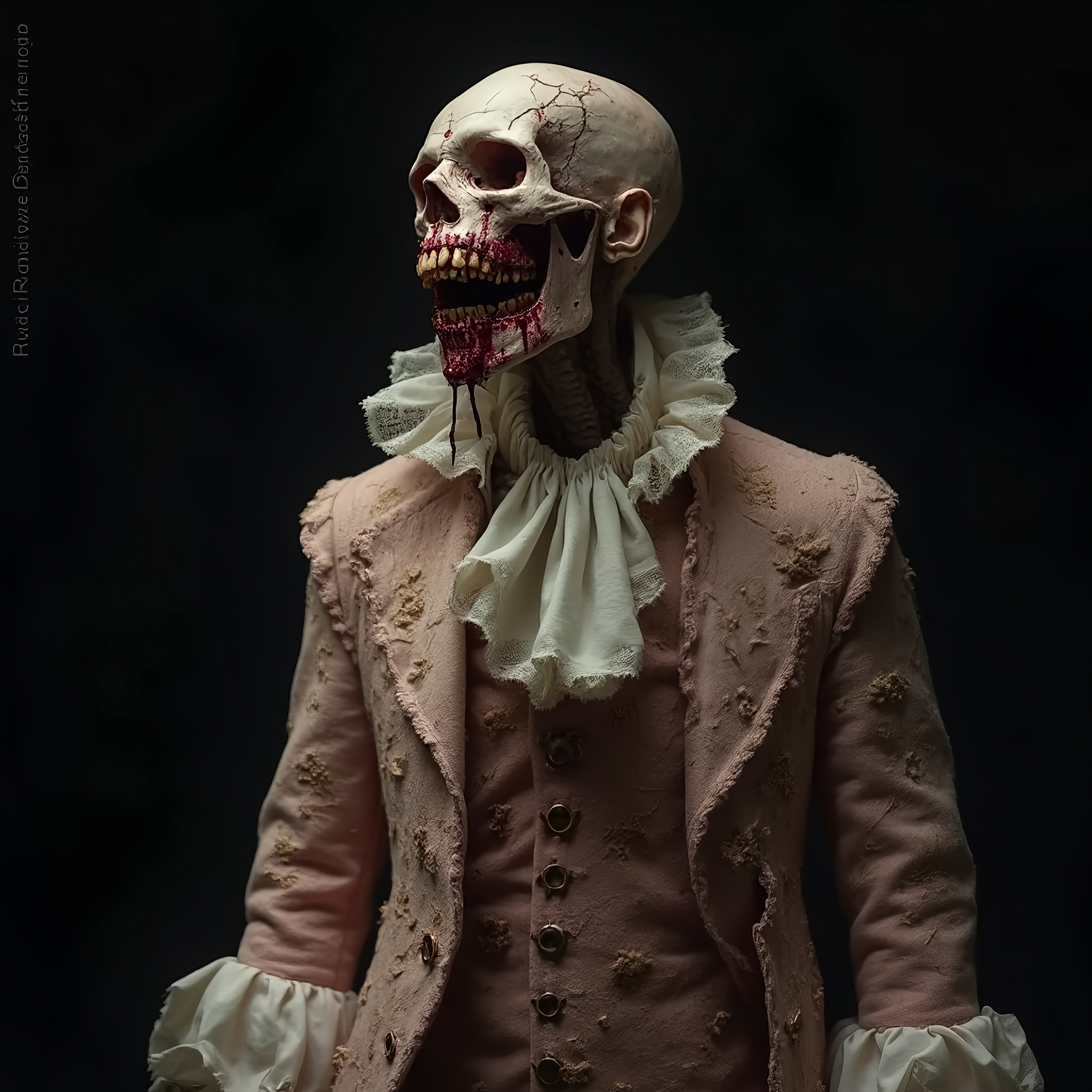 Description: A weathered skeleton dressed in a tattered pink Rococo suit, stained with blood. The cracked skull and decayed teeth are framed by an ornate ruffled collar, evoking both regality and grotesque rot.
