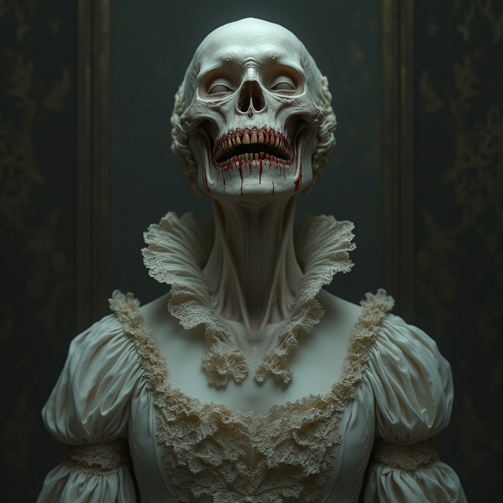 Description: A skeletal female figure with stretched neck anatomy, dressed in a Victorian lace gown. Blood trickles from her lips, and her eerie composure evokes a haunted elegance.