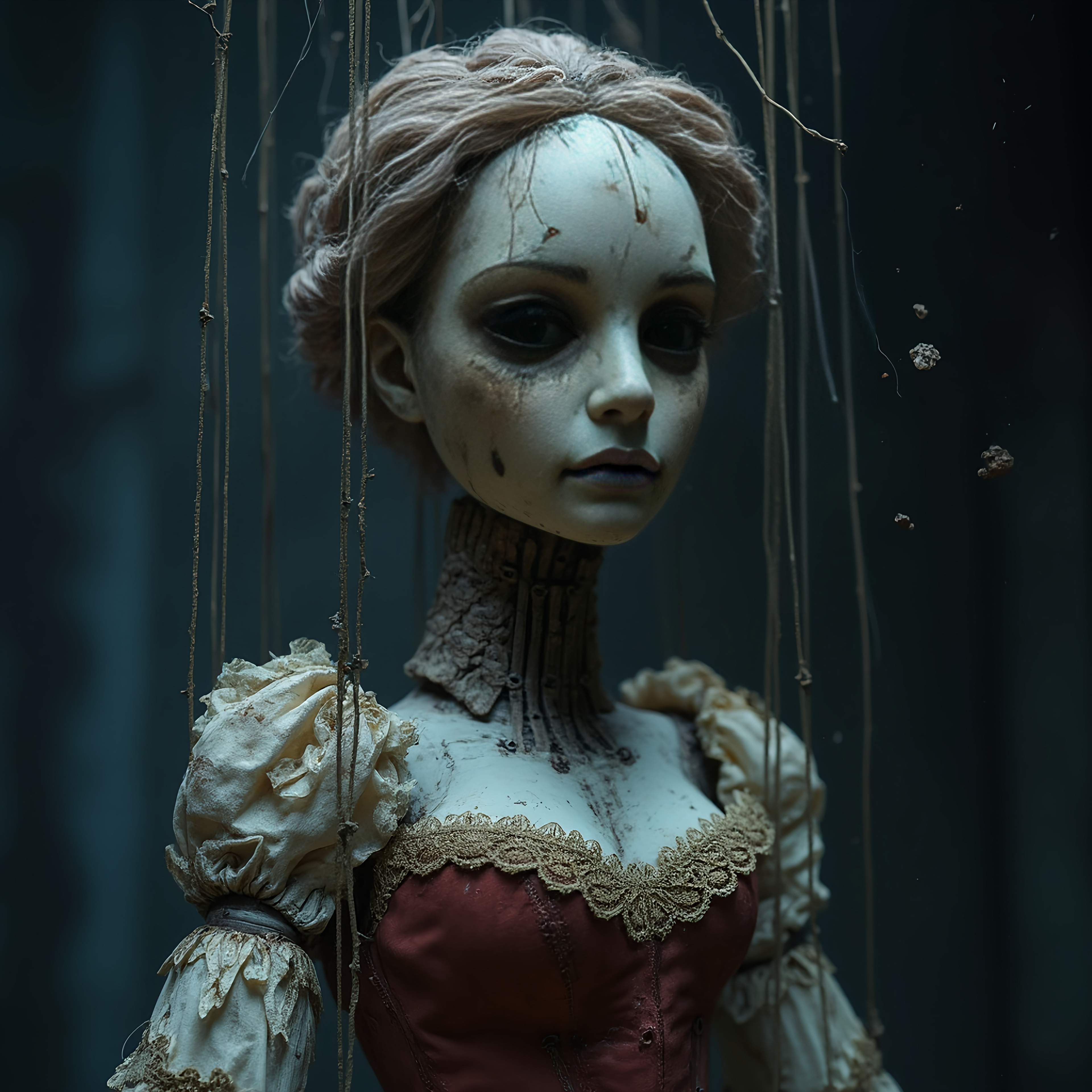 Description: A lifelike wooden marionette in decayed Rococo attire. Her cracked porcelain face and detached gaze evoke themes of manipulation and innocence lost.